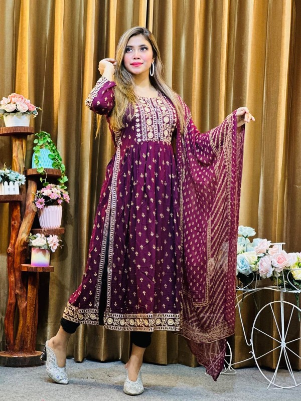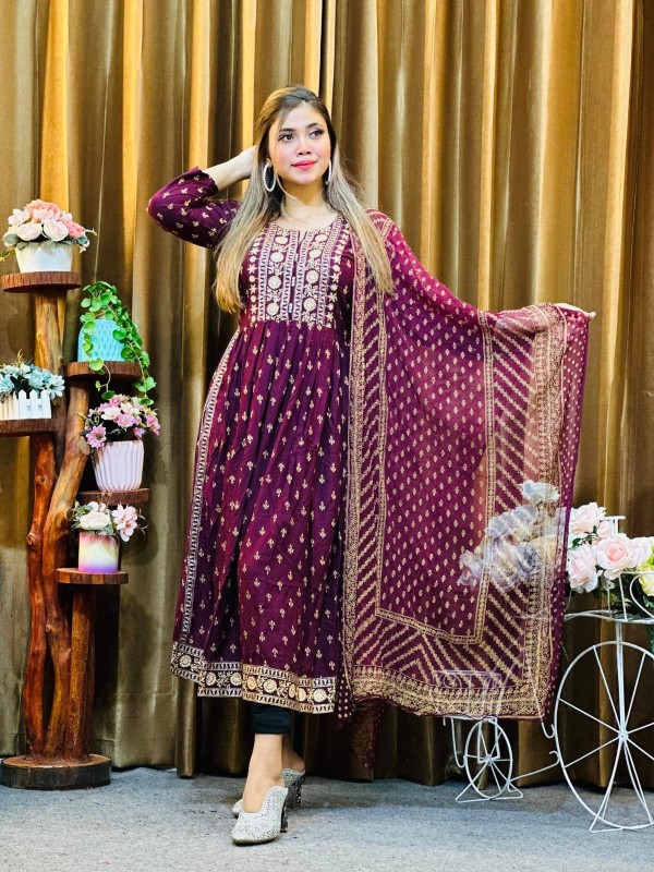 ডিজিটাল স্কিন প্রিন্ট রেডিমেড নায়রা কাট এমব্রয়ডারি এবং স্টোন ওয়ার্ক।