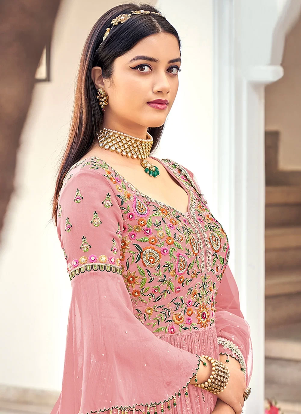 Exquisitely embroidered with traditional design, this red georgette Anarkali suit exudes feminine charm.