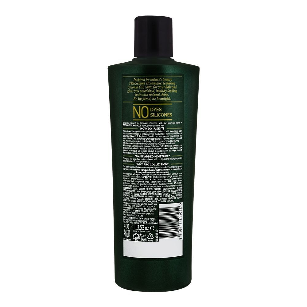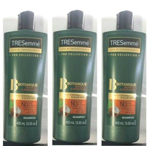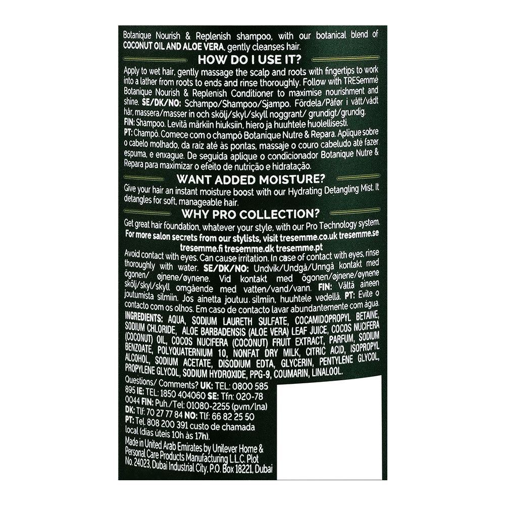 Infused with coconut milk and aloe vera – known to be nourishing – our professional-quality formula simultaneously cleanses and quenches hair each time you lather up, This shampoo is free from parabens, dyes and silicones and enriched with our botanical blend of coconut milk, coconut oil and aloe vera, The TRESemmé Botanique Nourish and Replenish Shampoo gently cleanses hair while leaving it nourished, Apply to wet hair, lather then rinse, Follow with the TRESemmé Botanique Conditioner, Finish with Botanique Hydrating mist before styling.
