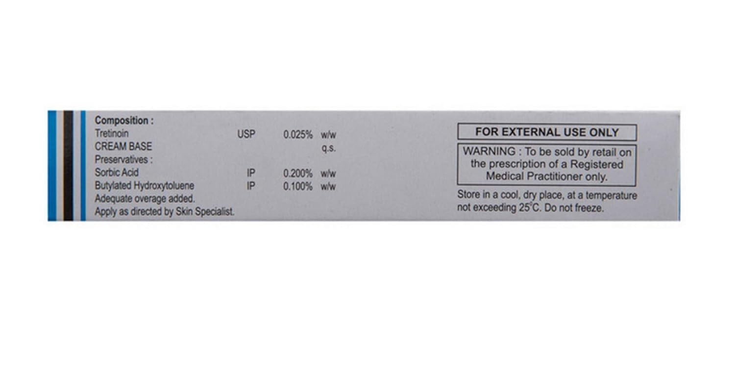 Tretinoin is a form of vitamin A that is used to treat acne which appears as spots or pimples on your face, chest or back. It also helps to smooth rough facial skin and to reduce fine wrinkles on the skin. Tretinoin reduces excessive oil production of the skin. Ideally, a pinpoint application at nighttime is recommended for the duration prescribed by your doctor. The amount you need and for how long you need to take it will depend on what you are being treated for. You should normally wash and dry the affected area before applying a thin layer of this medicine. Follow your doctor's instructions. You should not apply it to damaged or broken skin and avoid contact with your mouth, eyes and nose. It may take several weeks for your symptoms to improve but keep using it regularly to get the most benefit. Consult your doctor again if you do not notice any improvement after a few weeks. Using more medicine or applying it more often than prescribed will not make it work any faster and may increase the side effects. The most common side effects include irritation, dryness and redness of the skin. They are usually mild and improve as your body gets used to the medicine. Drink plenty of water and use moisturizer as it may lead to dryness of the mouth, lips and eyes. Let your doctor know if these side effects bother you or do not go away. Serious side effects with this medicine are rare. This medicine may make you more sensitive to sunlight so you should limit exposure to the sun if possible. It may make your skin more fragile. It is advised, not to have any waxing (hair removal), or laser treatments during treatment. Pregnant women or women who are planning to get pregnant should not use this medicine as it can lead to birth defects.