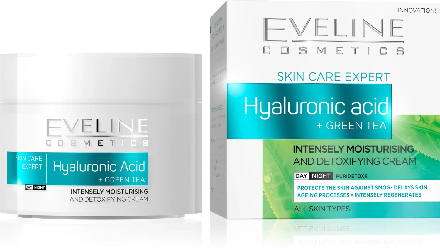 INTENSELY MOISTURISING AND DETOXIFYING CREAM was developed by the scientists from Eveline Cosmetics laboratory with the view to provide concentrated daily care, preventing premature skin aging, for all skin types. Unique formula combines the intense action of green tea extract and hyaluronic acid with the power of ANTI-POLLUTION advanced technology, providing spectacular moisturizing and detoxifying effects, comparable to the results of dermo aesthetic treatments.