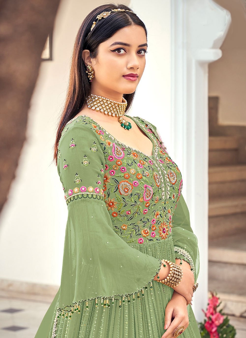 Faux Georgette Festive Gown Salwar Kameez in Green with Embroidered work