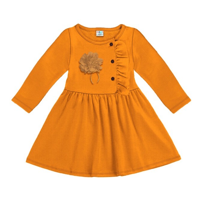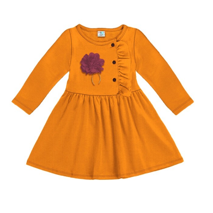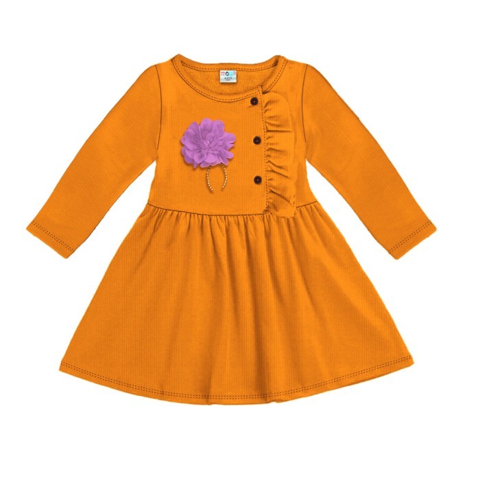 Introducing the Girls Cotton Knit Full Sleeves Frock in radiant 'Yellow,' adorned with a delightful Flower Applique (please note that the flower color may vary), exclusively available at Sonamoni.com. This frock combines style and comfort, making your little girl a true fashion star.