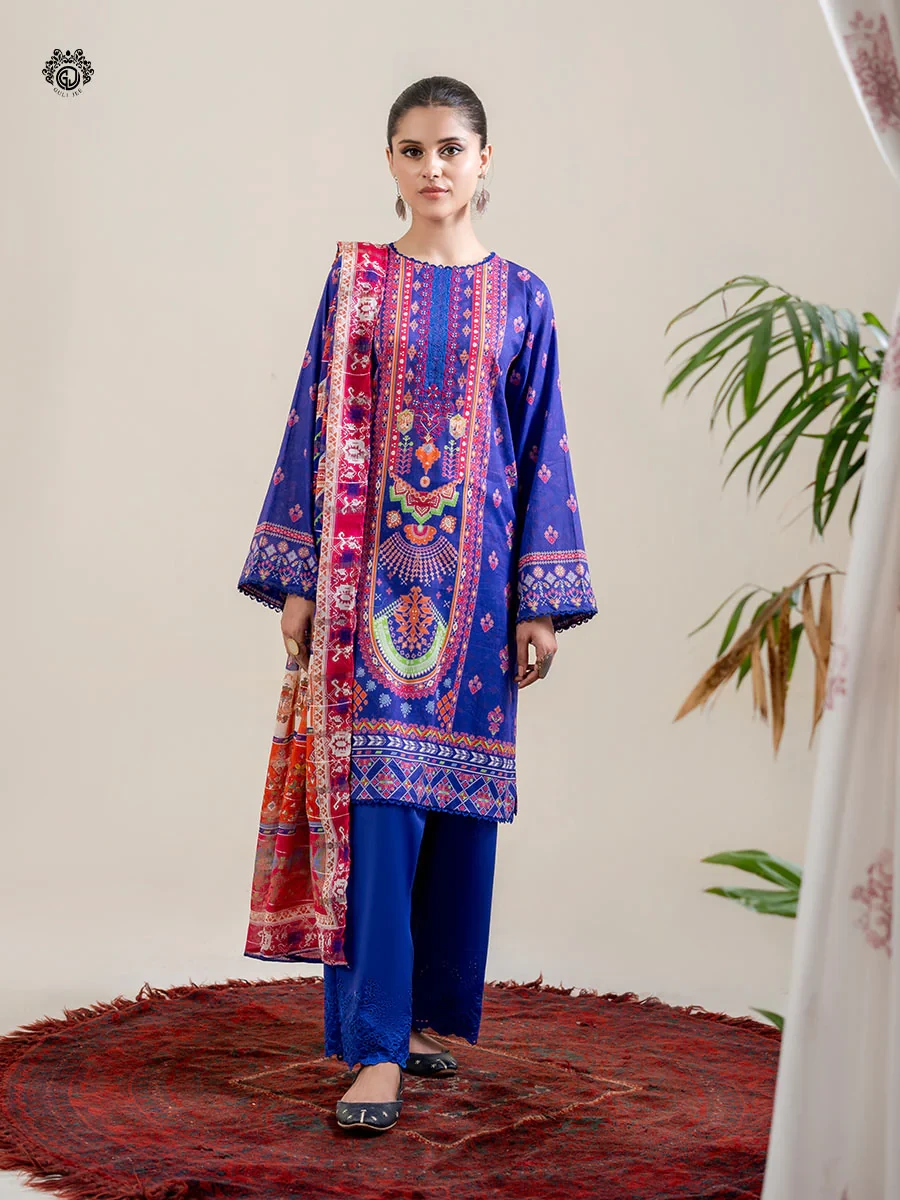 Gull Jee NAQSH - 3PC EMBROIDERED NECK DIGITAL PRINTED LAWN FRONT DYED COTTON CAMBRIC EMBROIDERED BORING TROUSER ZARI SEQUINE DUPPATA -GNAQ2301A12