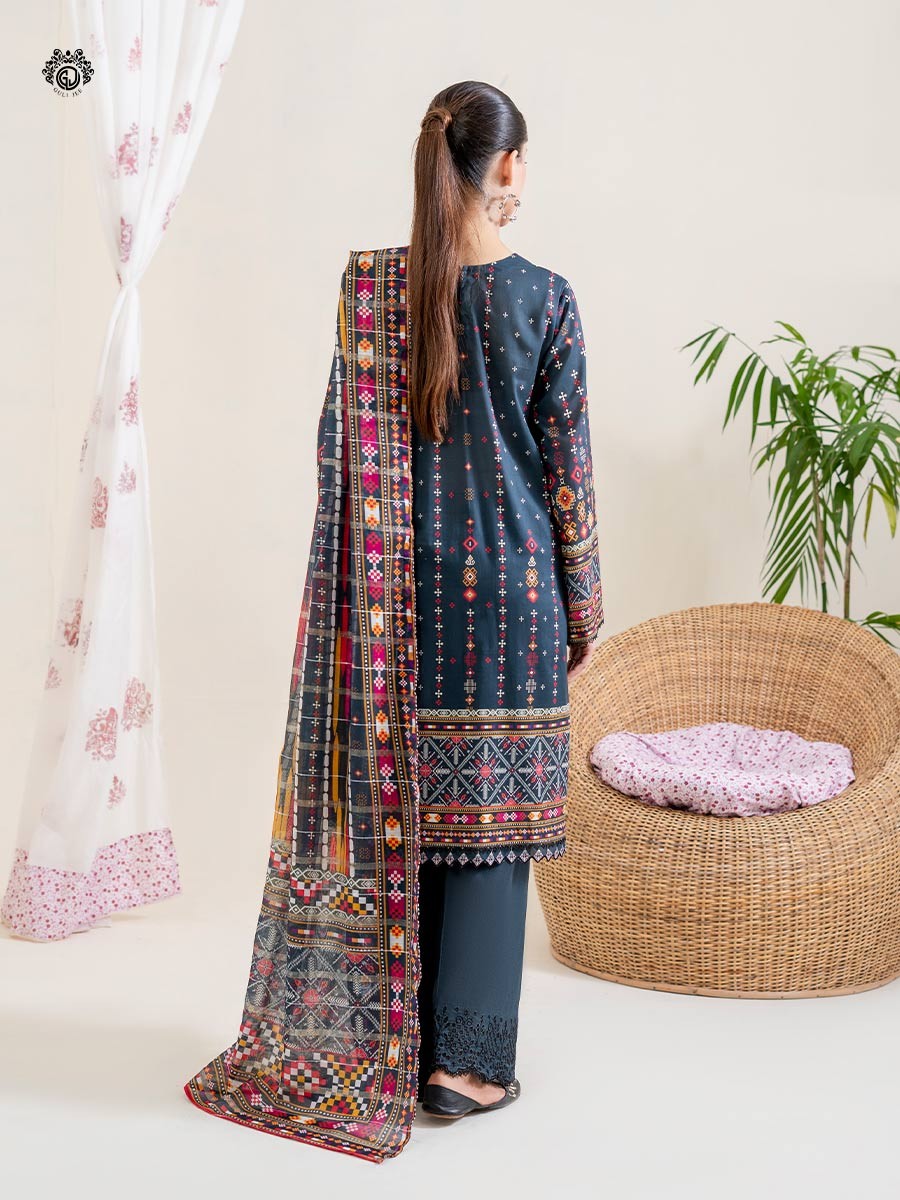 Gull Jee NAQSH - 3PC EMBROIDERED NECK DIGITAL PRINTED LAWN FRONT DYED COTTON CAMBRIC EMBROIDERED BORING TROUSER ZARI SEQUINE DUPPATA -GNAQ2301A8