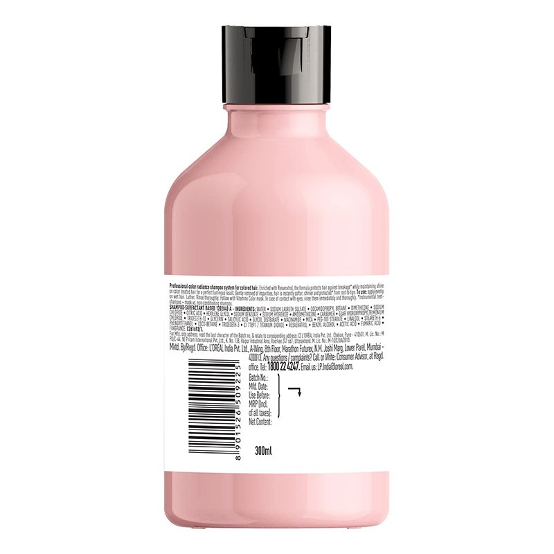 L'Oréal Professionnel Serie Expert Vitamino Color Resveratrol Shampoo is specifically designed for highlighted and colored hair. The shampoo is enriched with professional Resveratrol formula that contains powerful polyphenols, which protect the color from fading for up to 8 weeks. L'Oréal Vitamino Color Resveratrol Shampoo gently removes dirt, impurities, and excess oil from the hair and scalp whilst adding lustrous shine to leave hair radiant and healthy-looking without weighing it down.