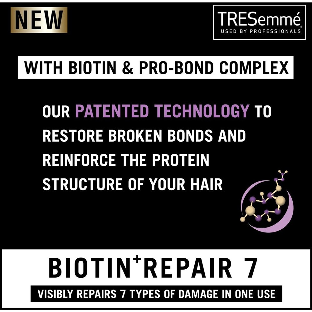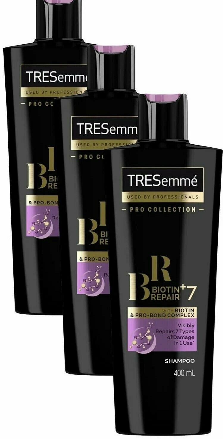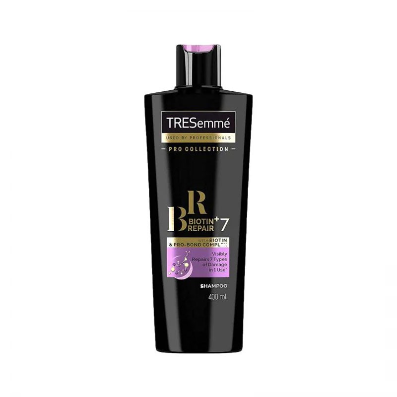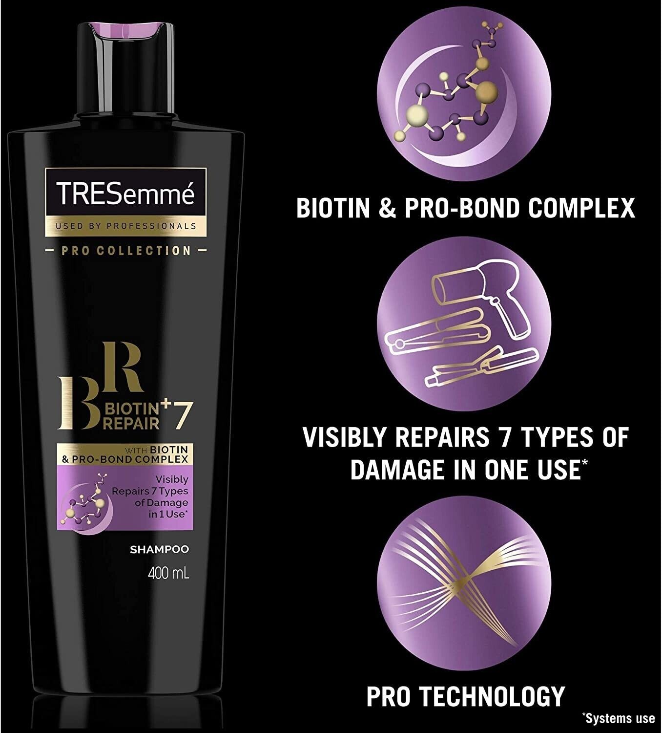 Tresemme BR Biotin +7 Repair Shampoo is a hair care product that is designed to help repair damaged hair and prevent further damage. The shampoo is formulated with biotin, which is a B vitamin that helps to strengthen hair, as well as other ingredients that are meant to nourish and protect hair. According to the product description, the Tresemme BR Biotin +7 Repair Shampoo is intended for use on hair that is prone to breakage, split ends, and damage from heat styling or chemical treatments. The shampoo is said to help repair the hair by penetrating the hair shaft and filling in gaps and damage with nourishing ingredients, leaving hair stronger and more resilient.